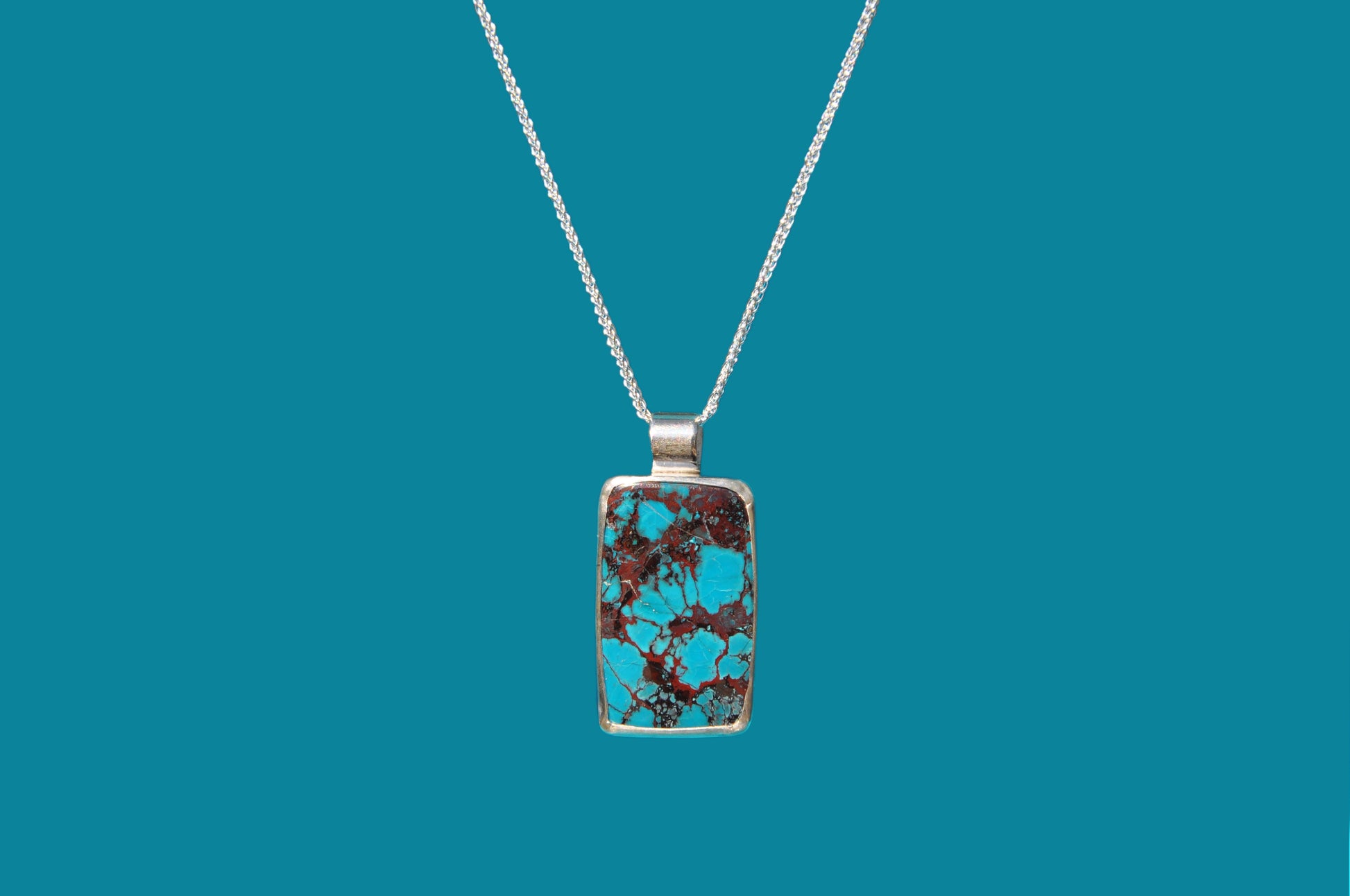 A rectangular chrysocolla stone with spiderweb-like veins bezel set in a .925 sterling silver pendant necklace. The setting and chain are .925 sterling silver.