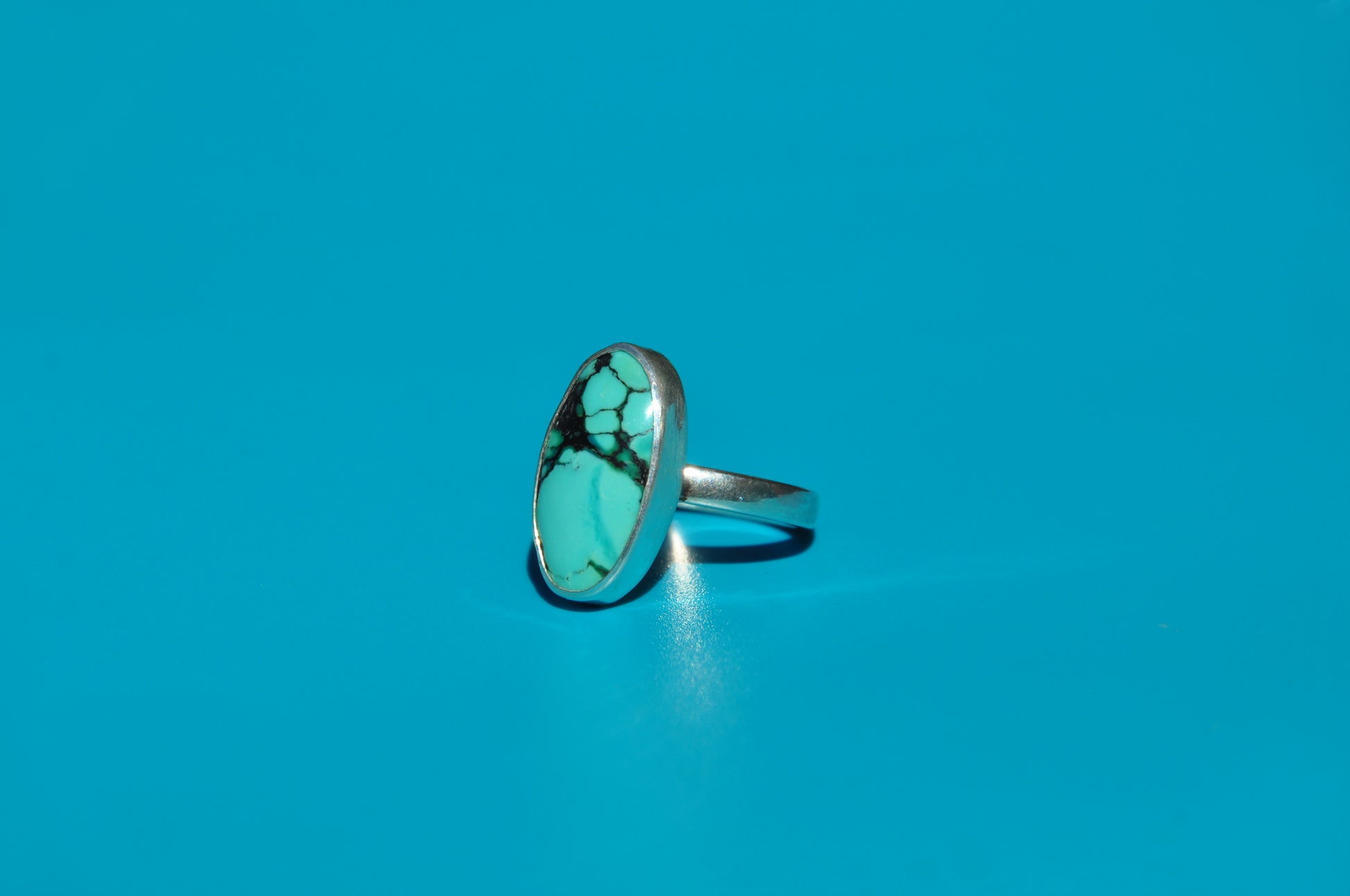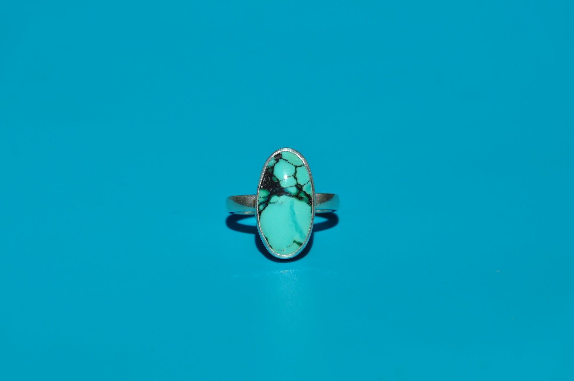 Yungai turquoise oval gemstone bezel set into a simple .925 sterling silver ring.