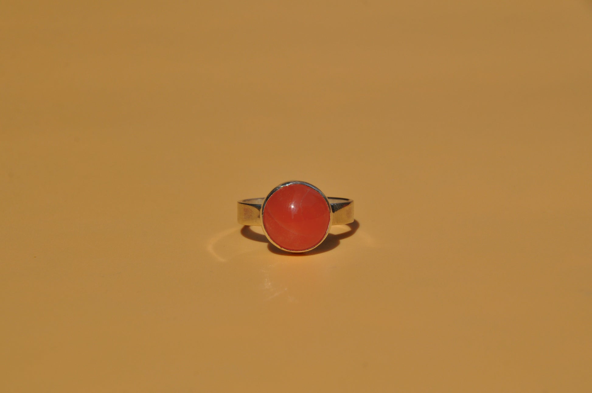 A vibrant carnelian circle gemstone bezel set into a simple 925 sterling silver ring. Resizing options are available at resizing price.