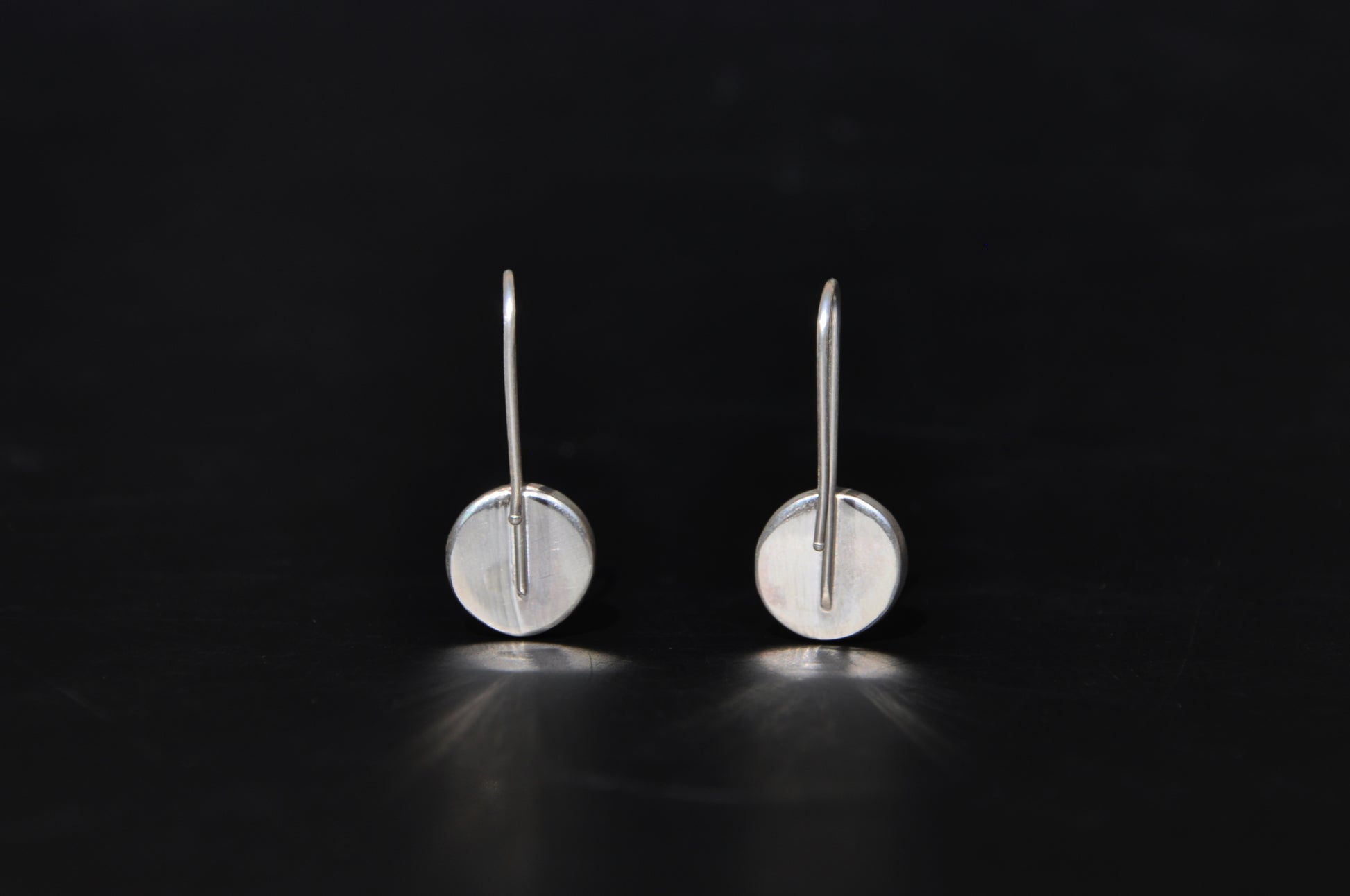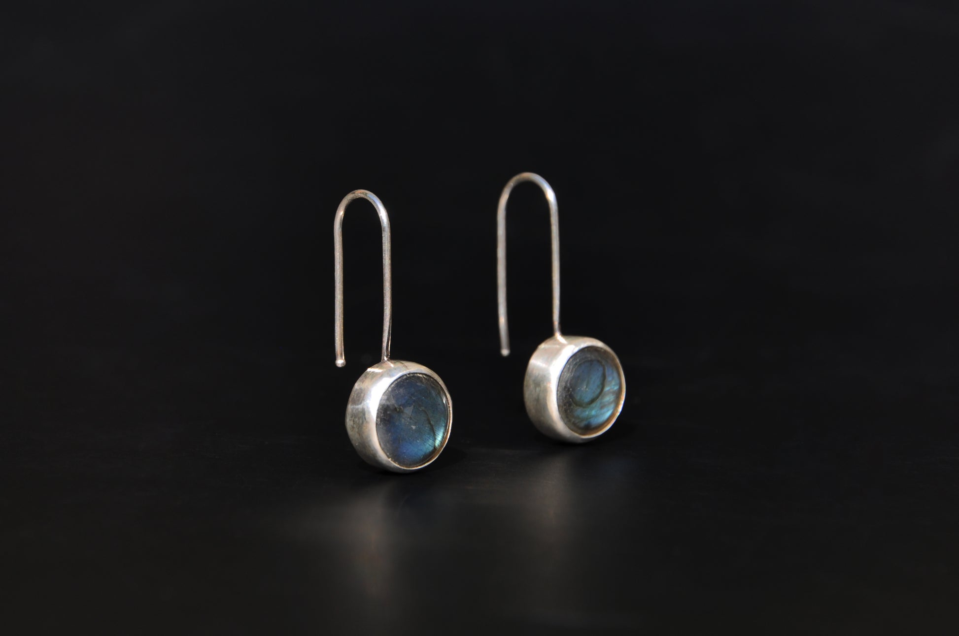 Round labradorite stones with beautiful blue flash bezel set into a pair of simple 925 sterling silver drop earrings.