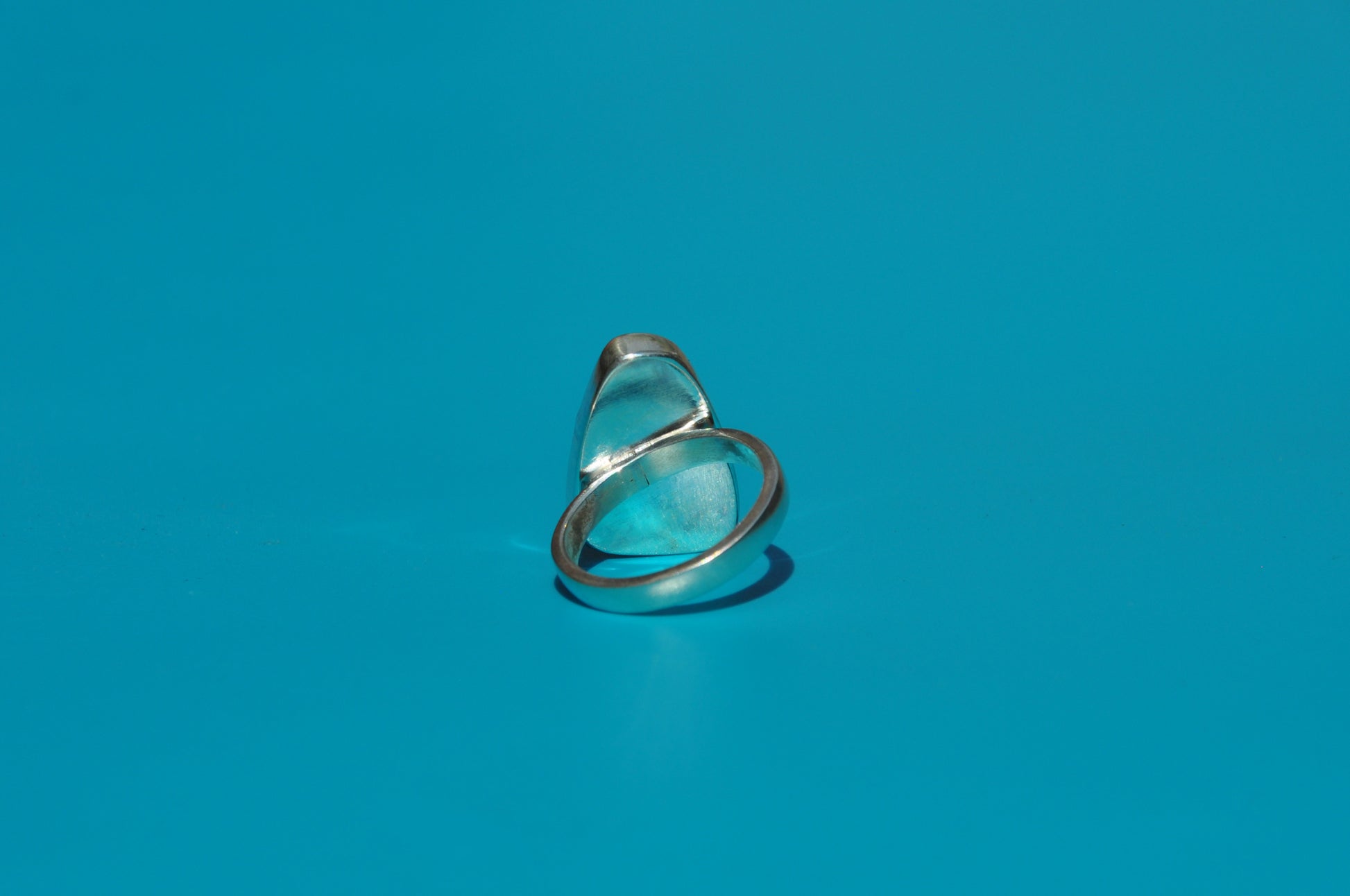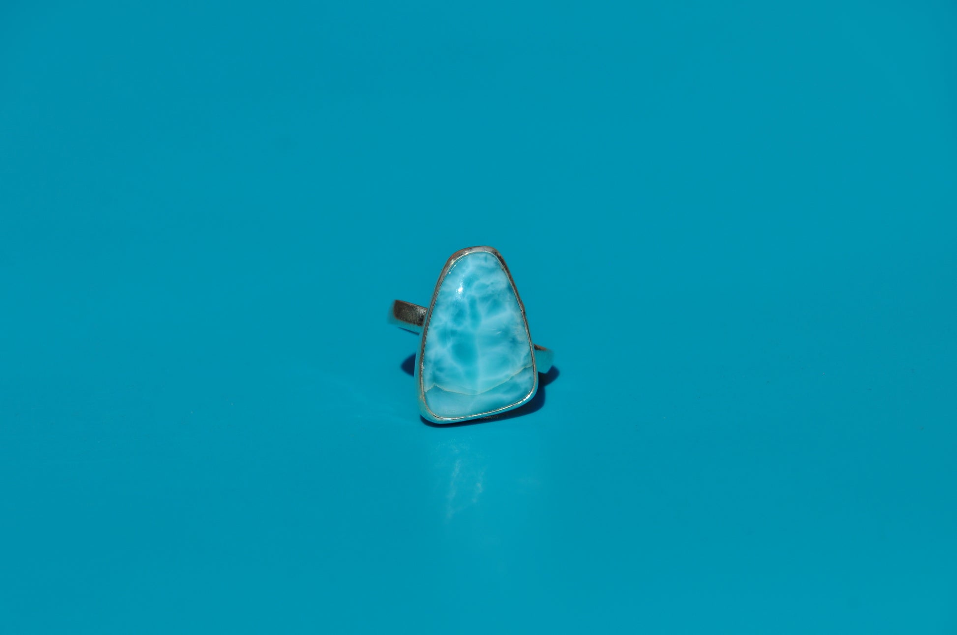 Beautiful larimar stone bezel set into a simple .925 sterling silver statement ring. Larimar is beautifully representative of the Caribbean aesthetic, which is perfect since it is only found in the Dominican Republic.