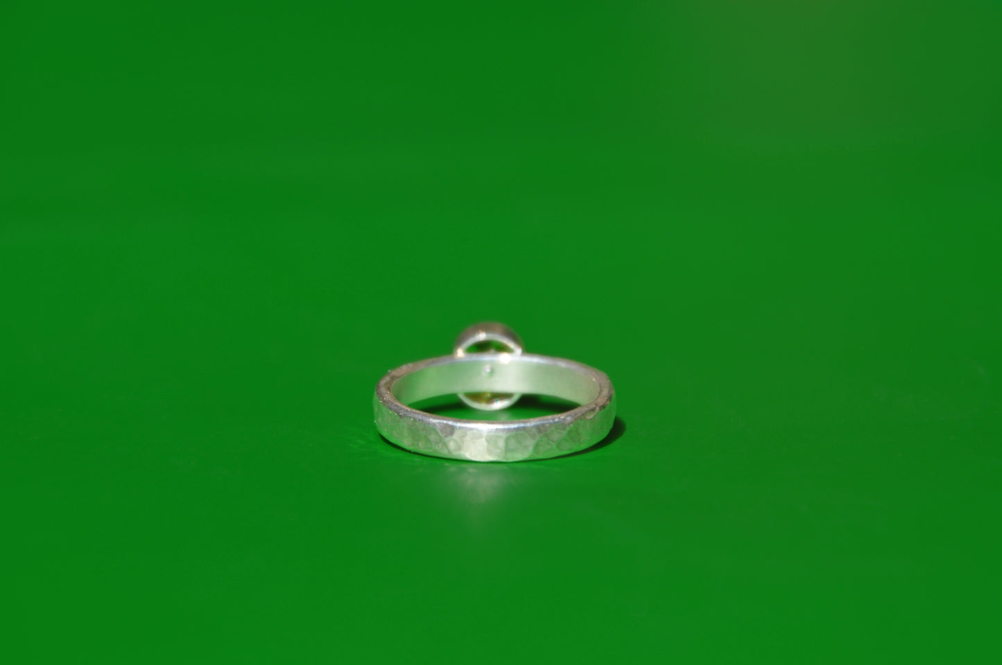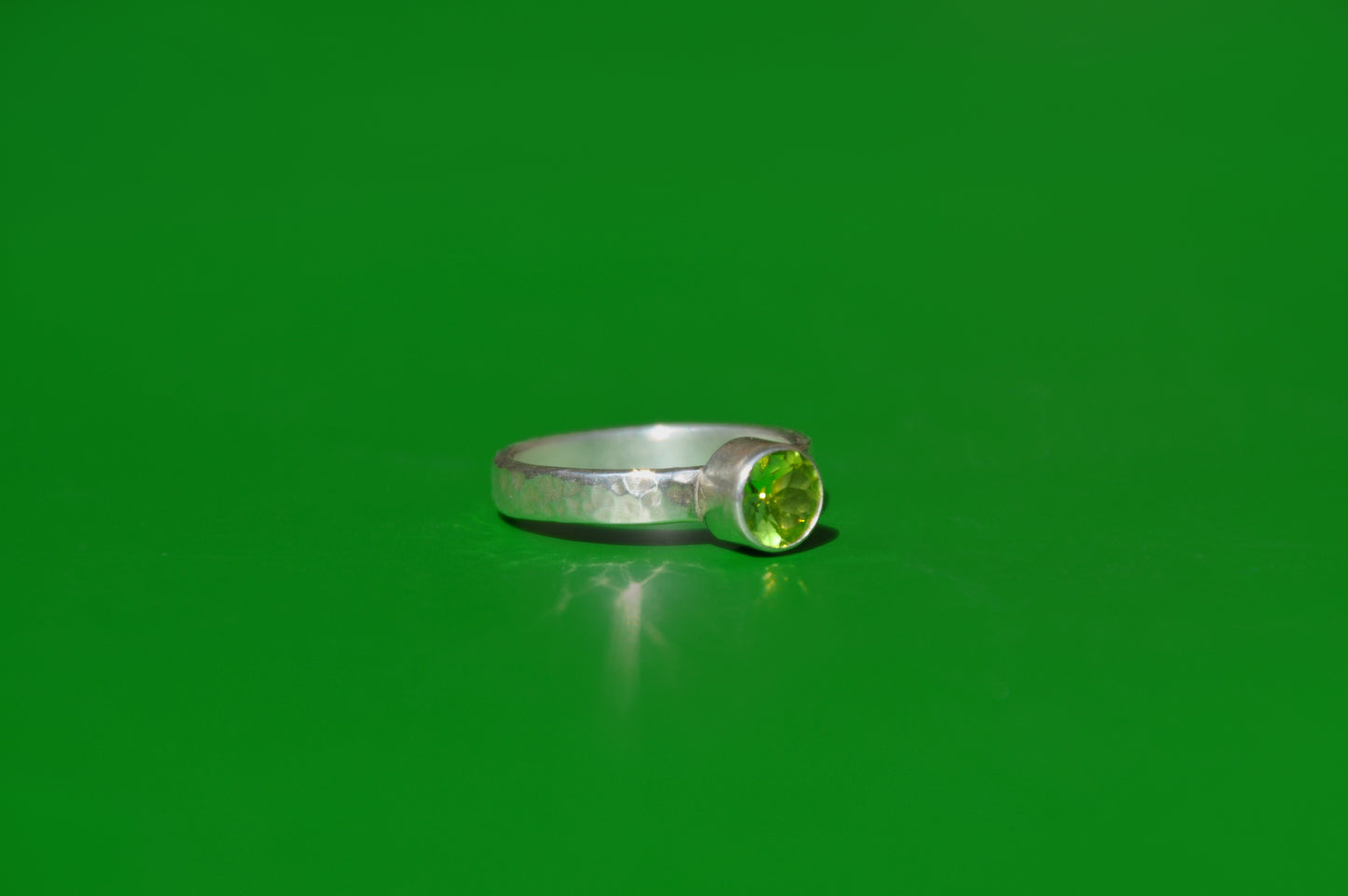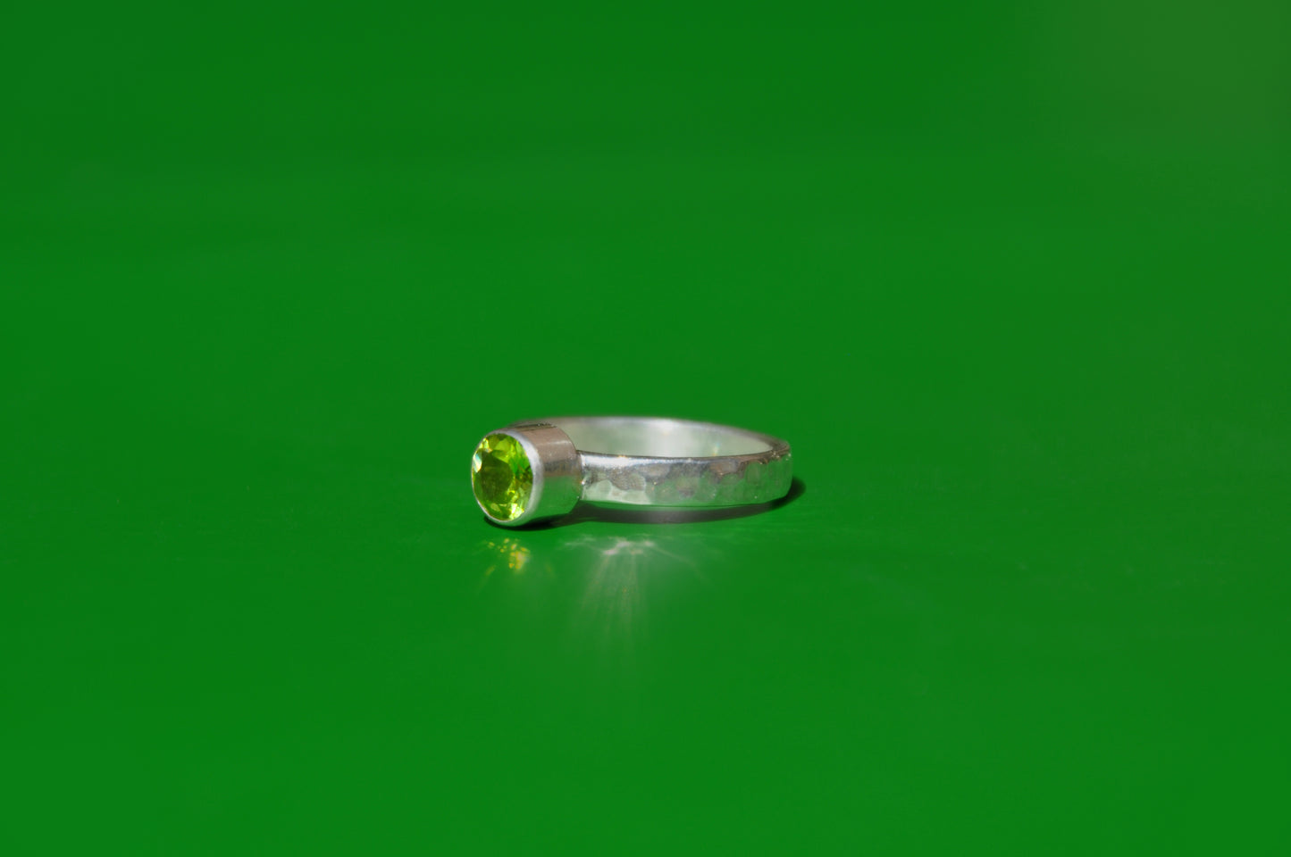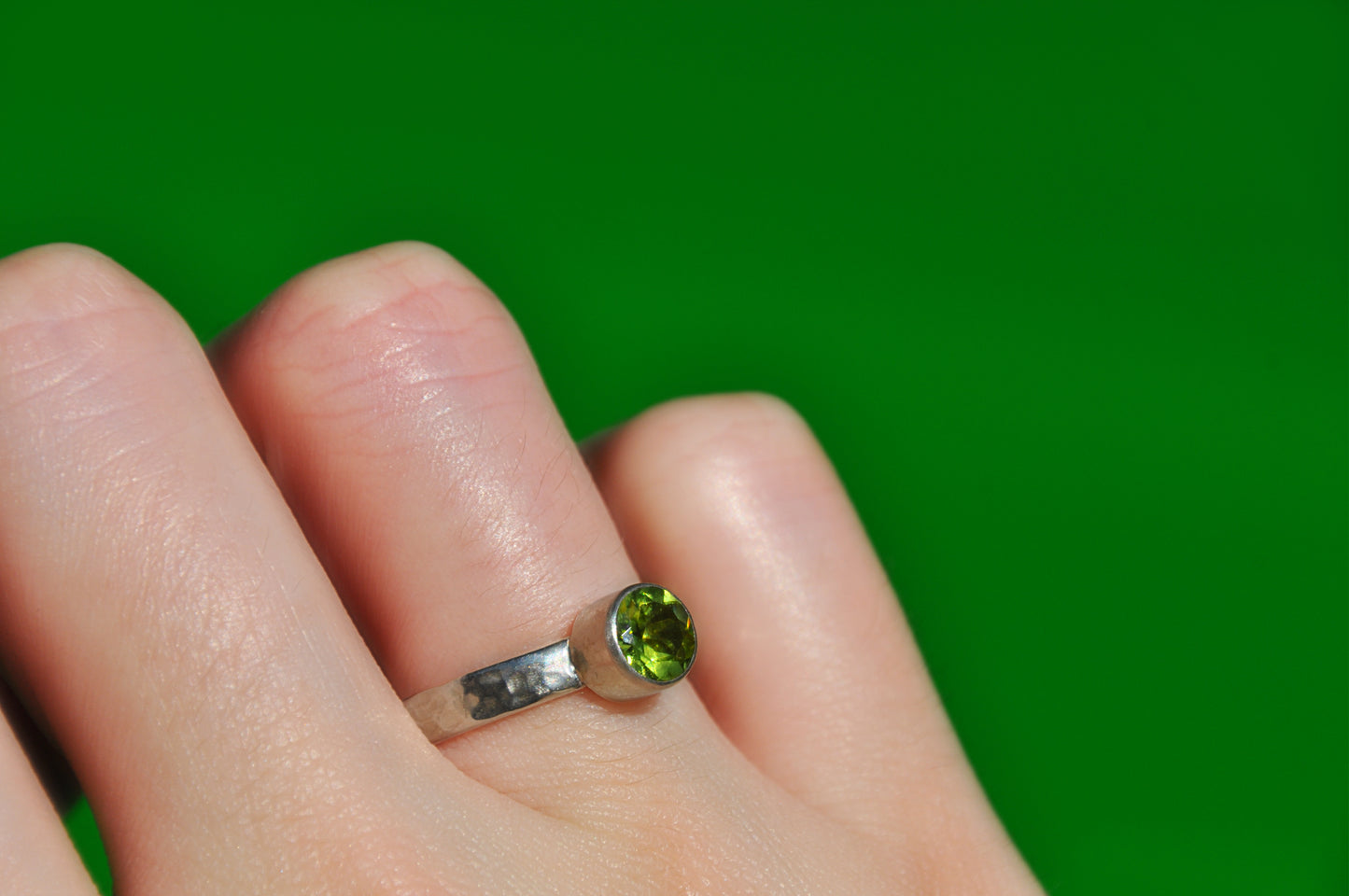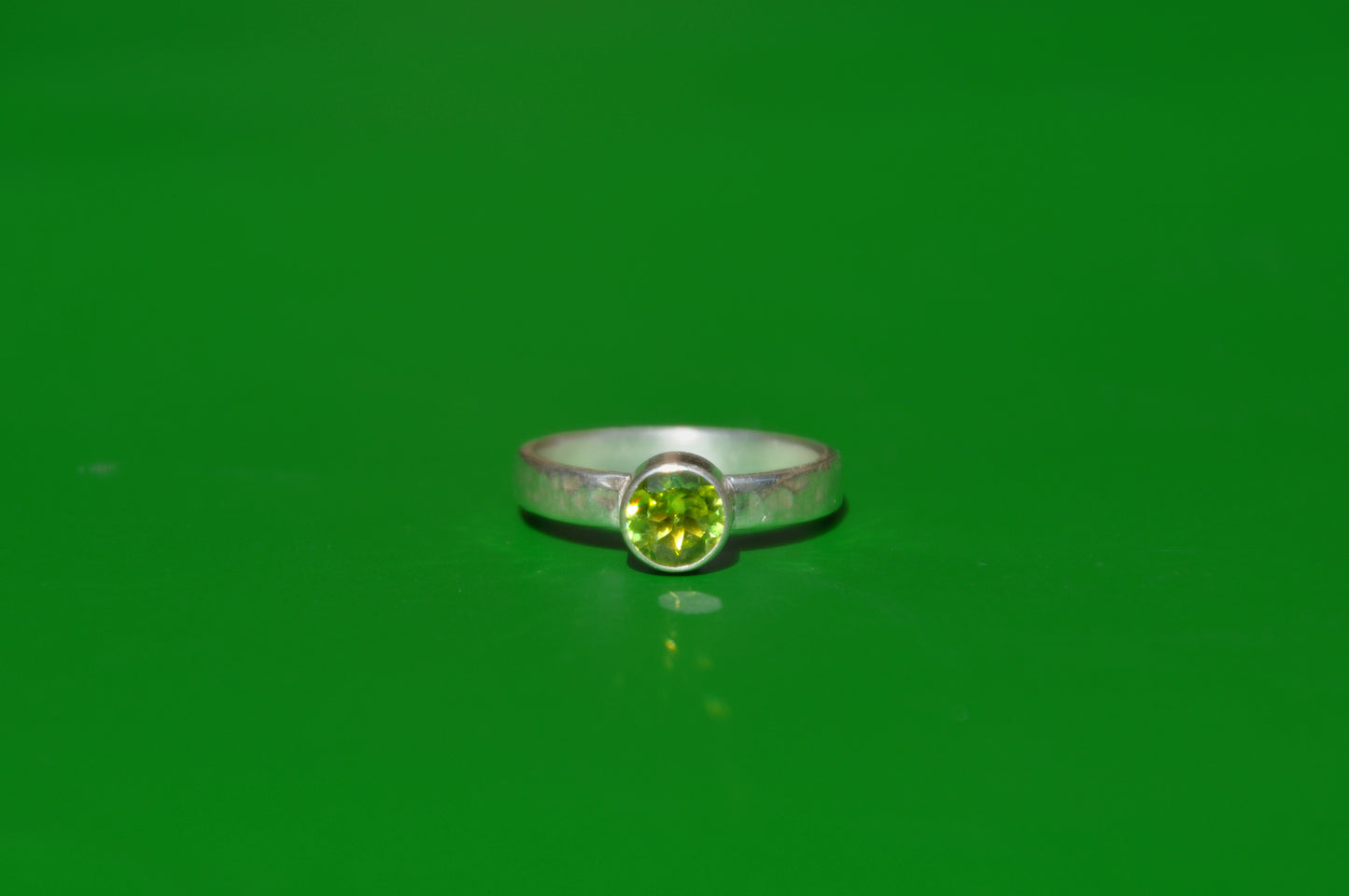 Peridot is the August birthstone. This one is tube set into a simple .925 sterling silver ring.