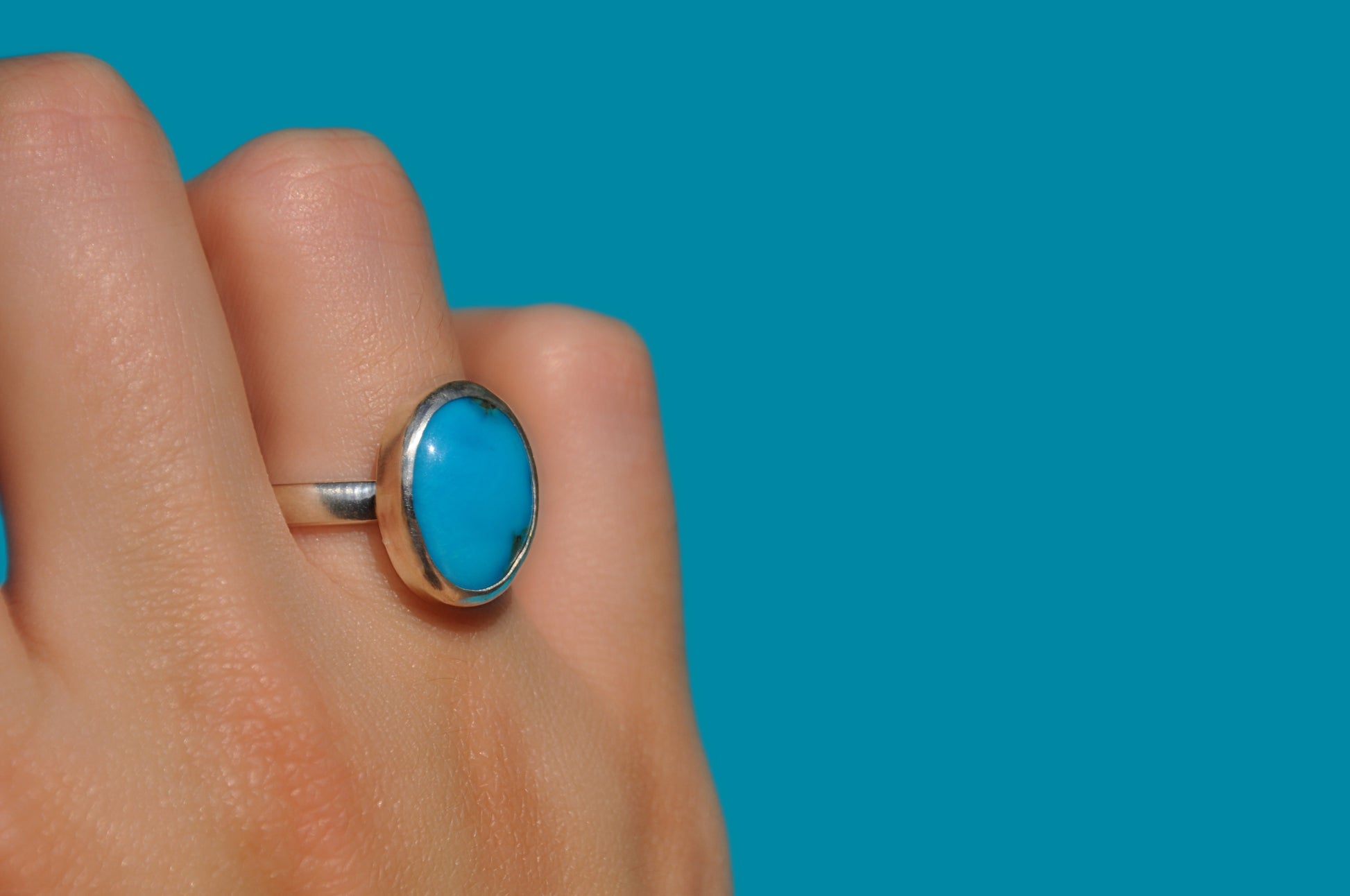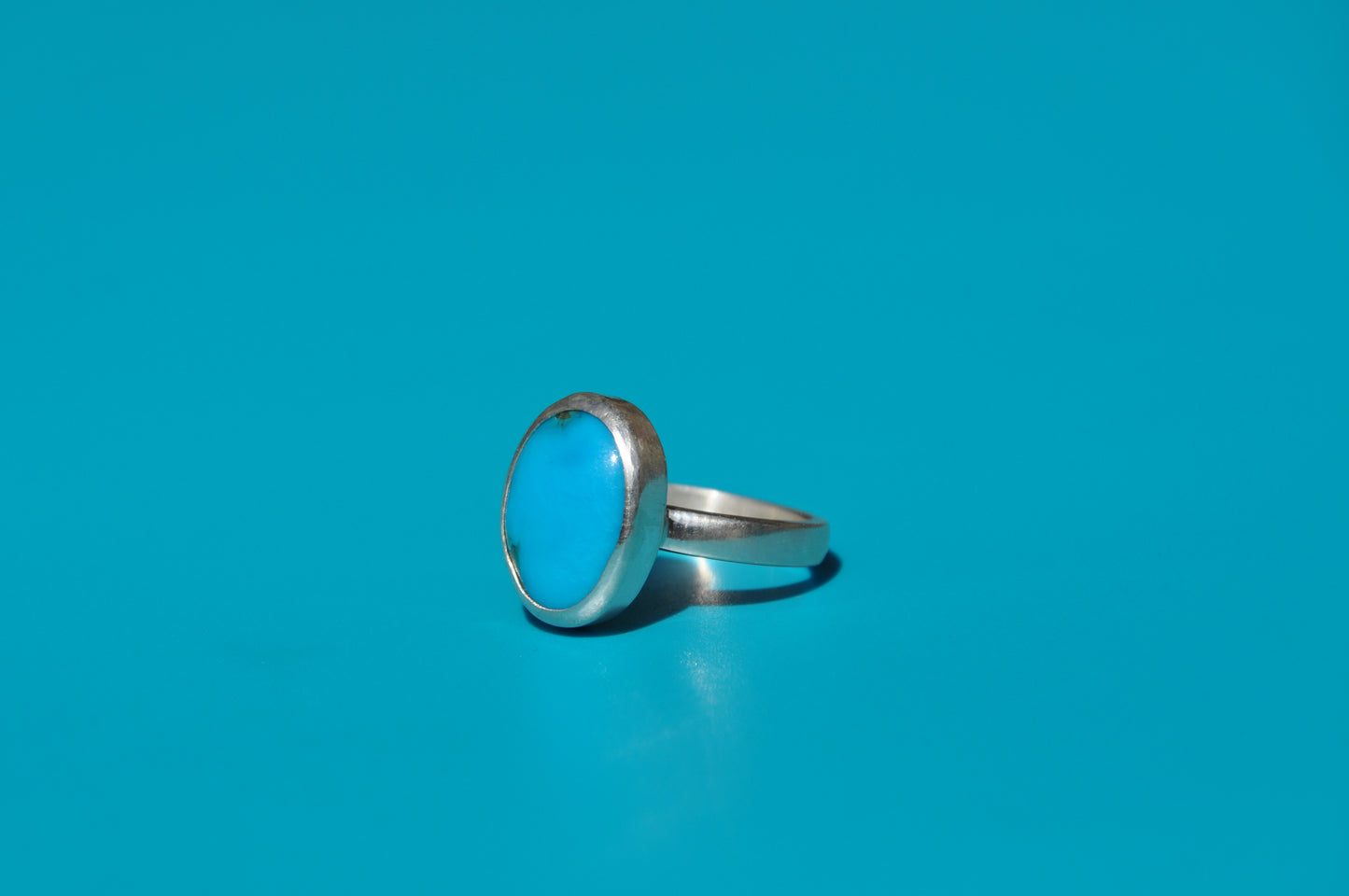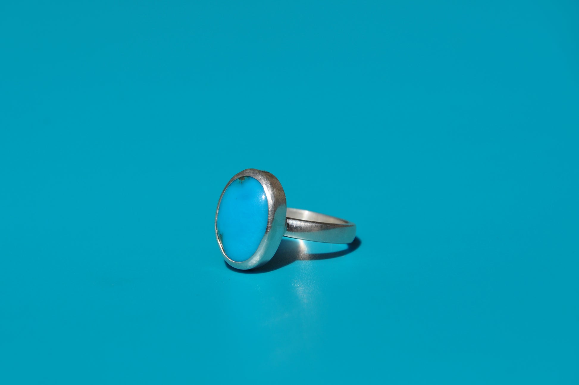 The oval turquoise in this ring is from the Sleeping Beauty mine. It is bezel set into .925 sterling silver.
