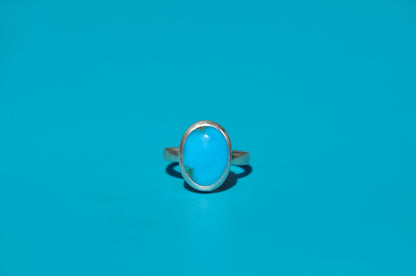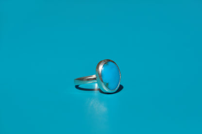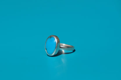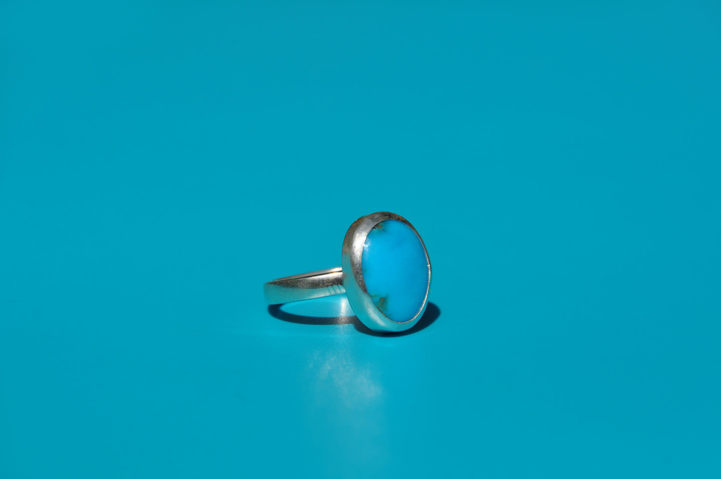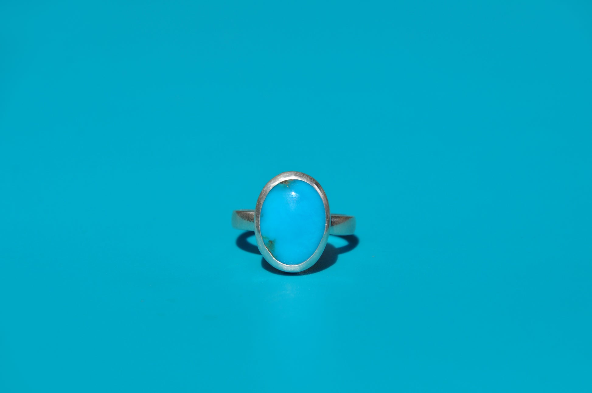 The oval turquoise in this ring is from the Sleeping Beauty mine. It is bezel set into .925 sterling silver.